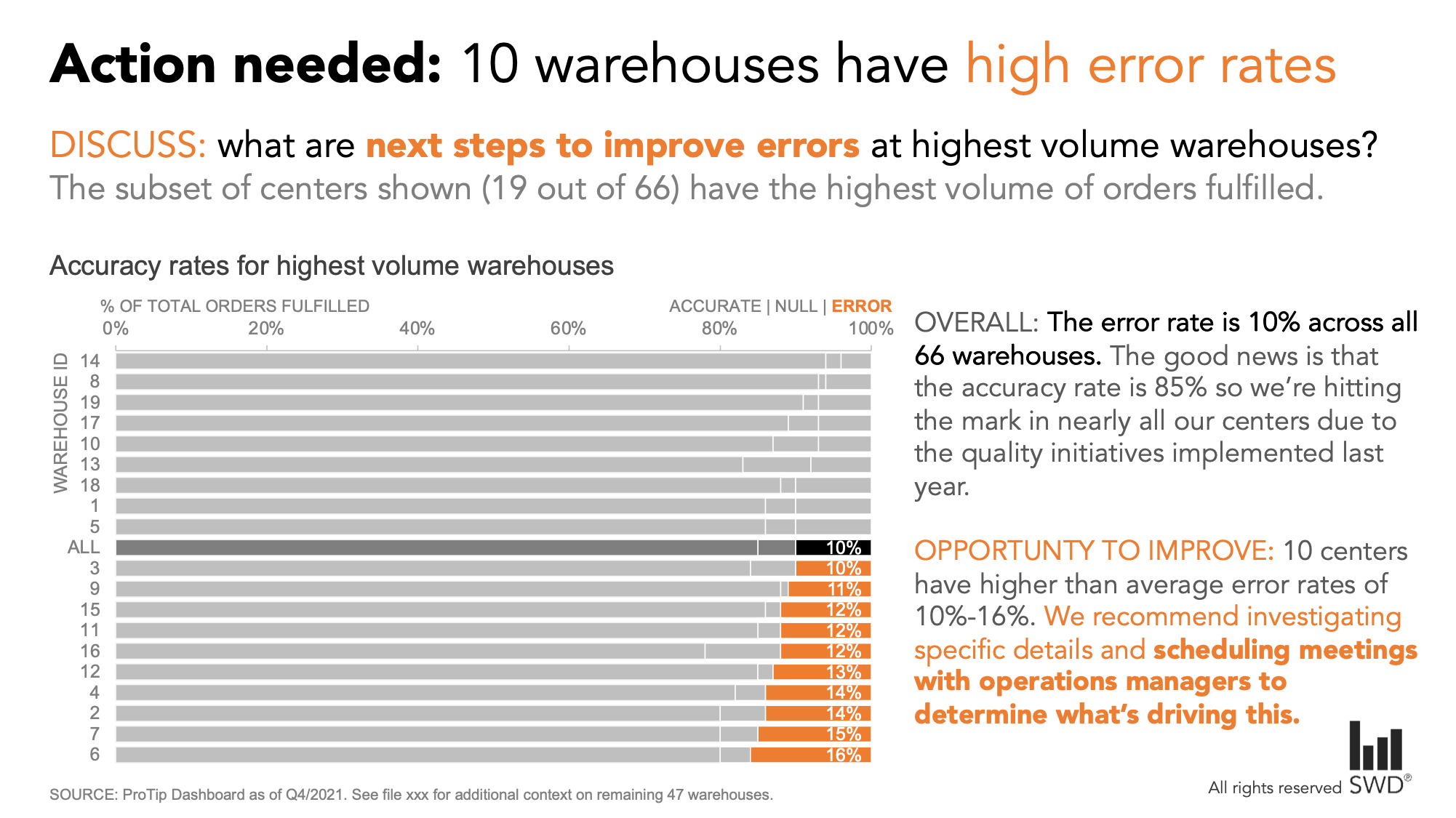 Visual choice: I’m familiar with a bar chart, including the specific variation shown here, the 100% stacked bar, so I’m not faced with the hurdle of trying to decide how to decipher an uncommon visual type. With some modifications (which we’ll get into later), this visual type should work well to explain the main message of this communication: the breakdown of performance (accurate vs inaccurate rates) across the warehouses of interest.