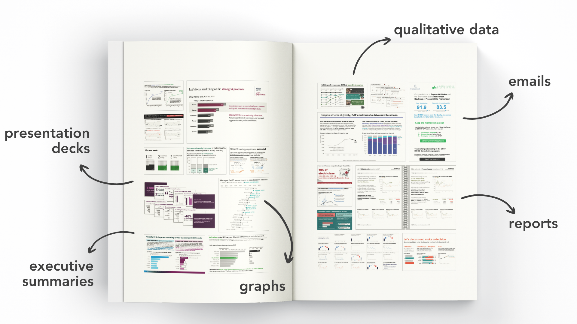 Because these case studies represent real client work we've done across various industries, the examples vary significantly. We show makeovers for ad hoc graphs, emails, dashboards, scorecards, reports, executive summaries, and even entire slide decks. There are qualitative datasets, maps, violin charts, survival curves, and, of course, the standard lines, bars, and pies.