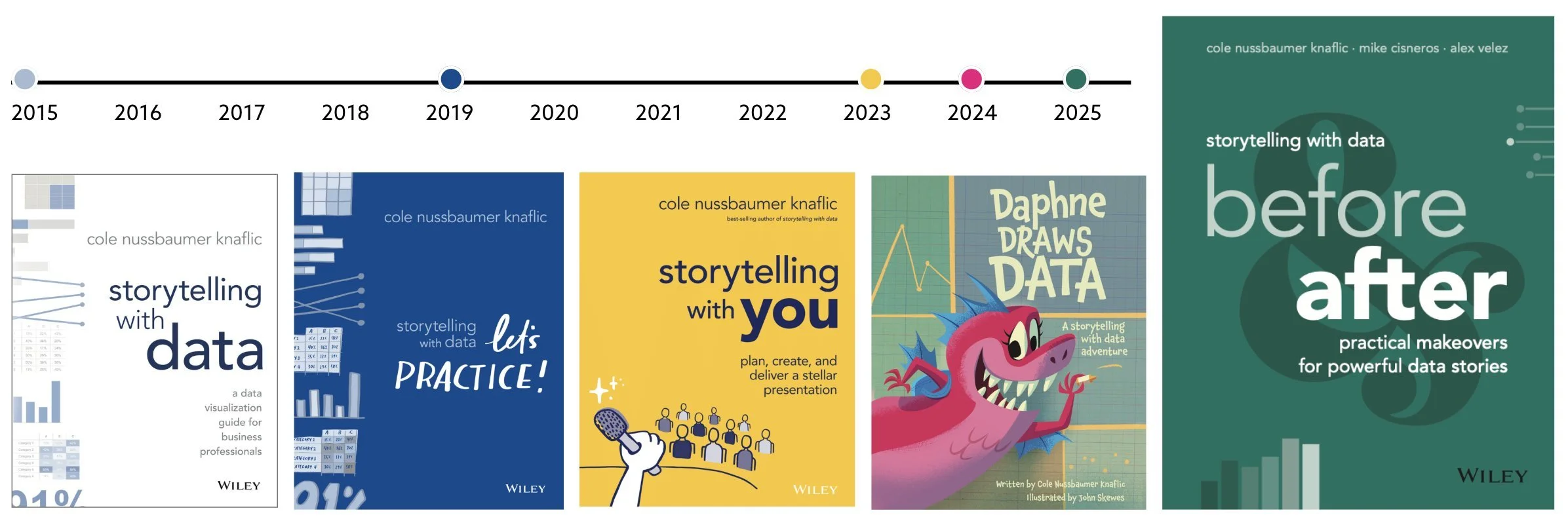 Since joining the company in 2019, we’ve added three (soon to be four) new books to the SWD library. Let’s Practice! (“the blue book”) is a workbook featuring hundreds of exercises to hone specific skills like choosing the right graph type and decluttering charts. In 2023, “the yellow book”, storytelling with you, was published as a guide for public speaking so that anyone—data professional or not—could learn to deliver better presentations. And last year, we ventured into the children’s space with Daphne Draws Data, showing kids that math and data can be fun! This year, we are returning to adults with “the teal book”.
