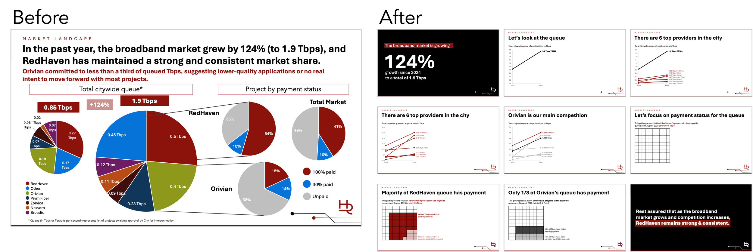The following slide was part of a deck shared at a previous board meeting. The goal was to discuss the competitive broadband market, and reassure board members that the company remained the top provider in the city, despite increased competition.