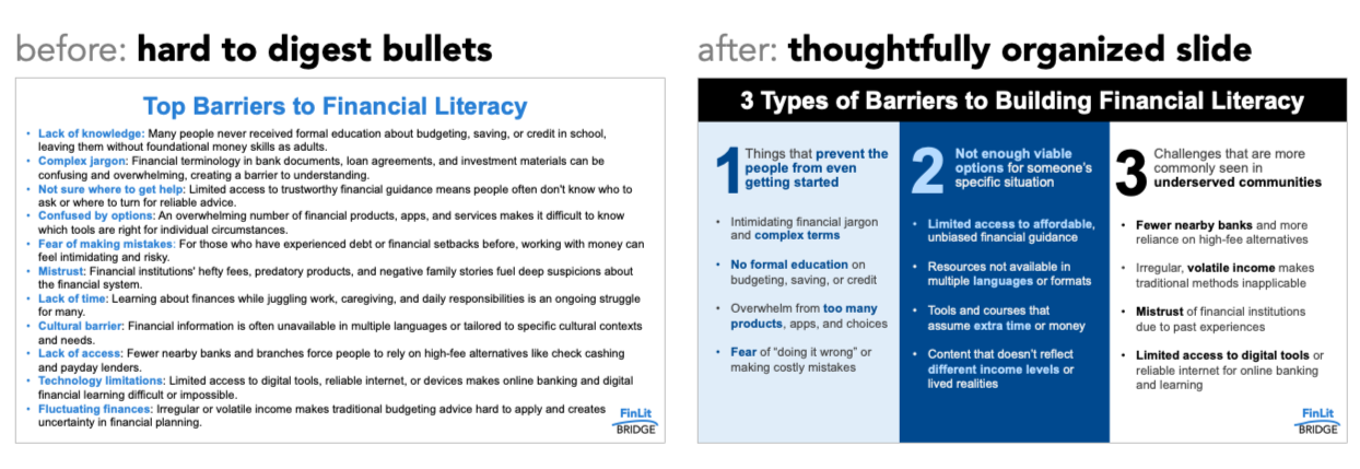 If you read the slide above carefully, you’ll notice it’s not wrong. The bullets are specific and describe real barriers. But imagine encountering this in a meeting or while checking your inbox. It’s hard to scan, and you’d likely give up reading after a couple of bullets. I’ll walk you through a simple transformation that reframes and reorganizes these same ideas so an audience can quickly grasp the information.