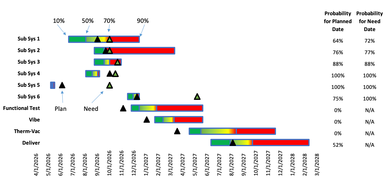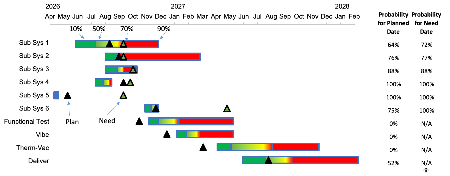 This is a project schedule with risk assessments showing the probability distributions for each activity of interest. The colors of the bar represent the likelihood of completion. For instance, the green portions towards the left show optimistic timing (10–50%), while the red portions indicate later, more likely completion dates (70–90%).