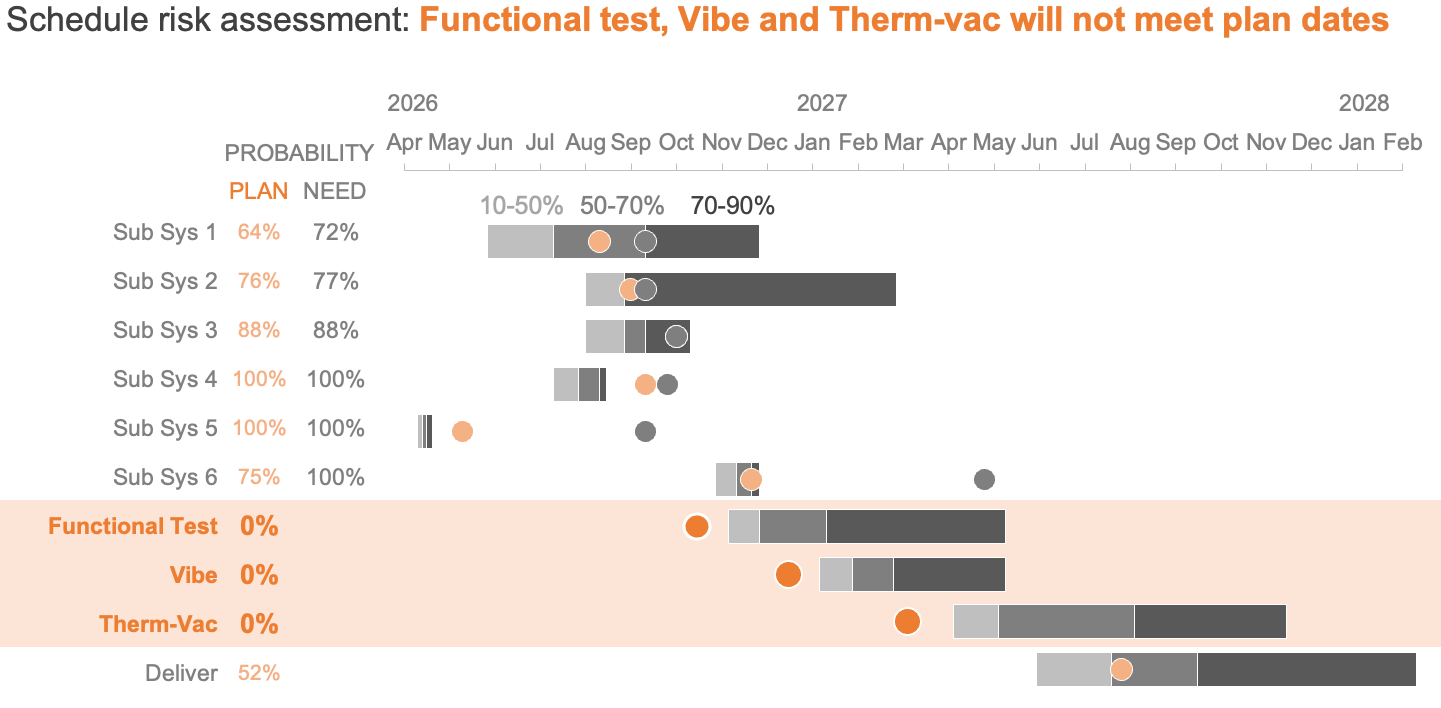 As things stand, the Functional Test, Vibe, and Therm-Vac tasks have zero probability of being completed on time. A simple way to quickly get this point across is to add a takeaway in words at the top of the chart to tell our audience what we want them to know.