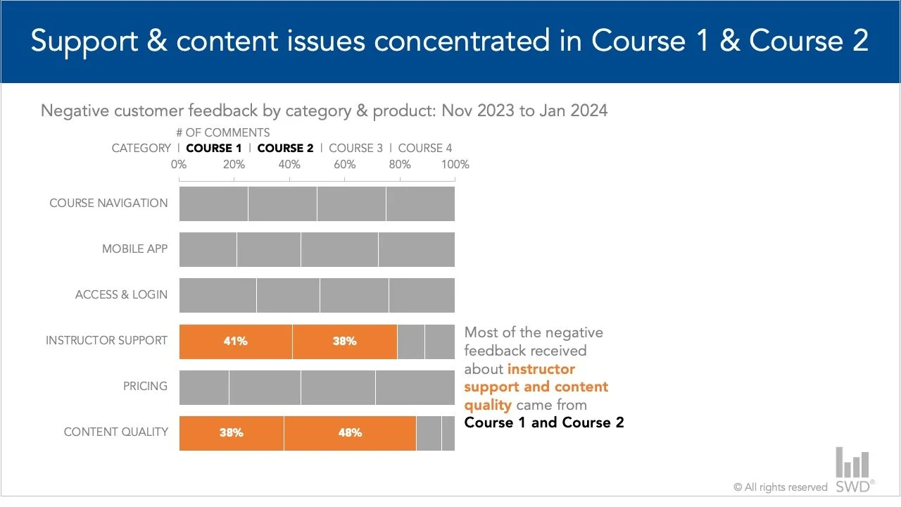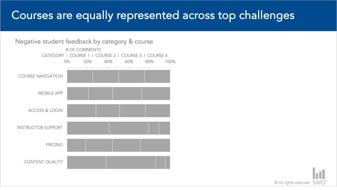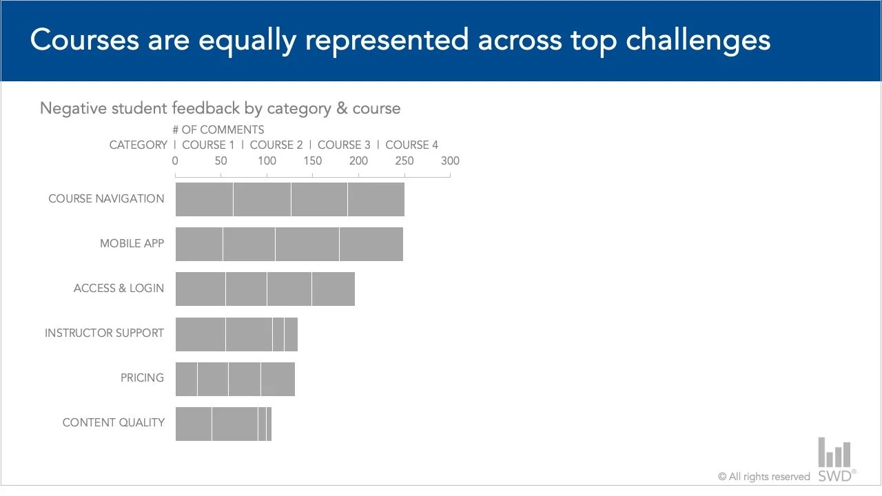 Let’s consider an example. Recently, I was working with an online education provider who collected negative feedback from students about various aspects of their digital learning experience across four different courses. Below are two sequenced slides included in the original presentation.