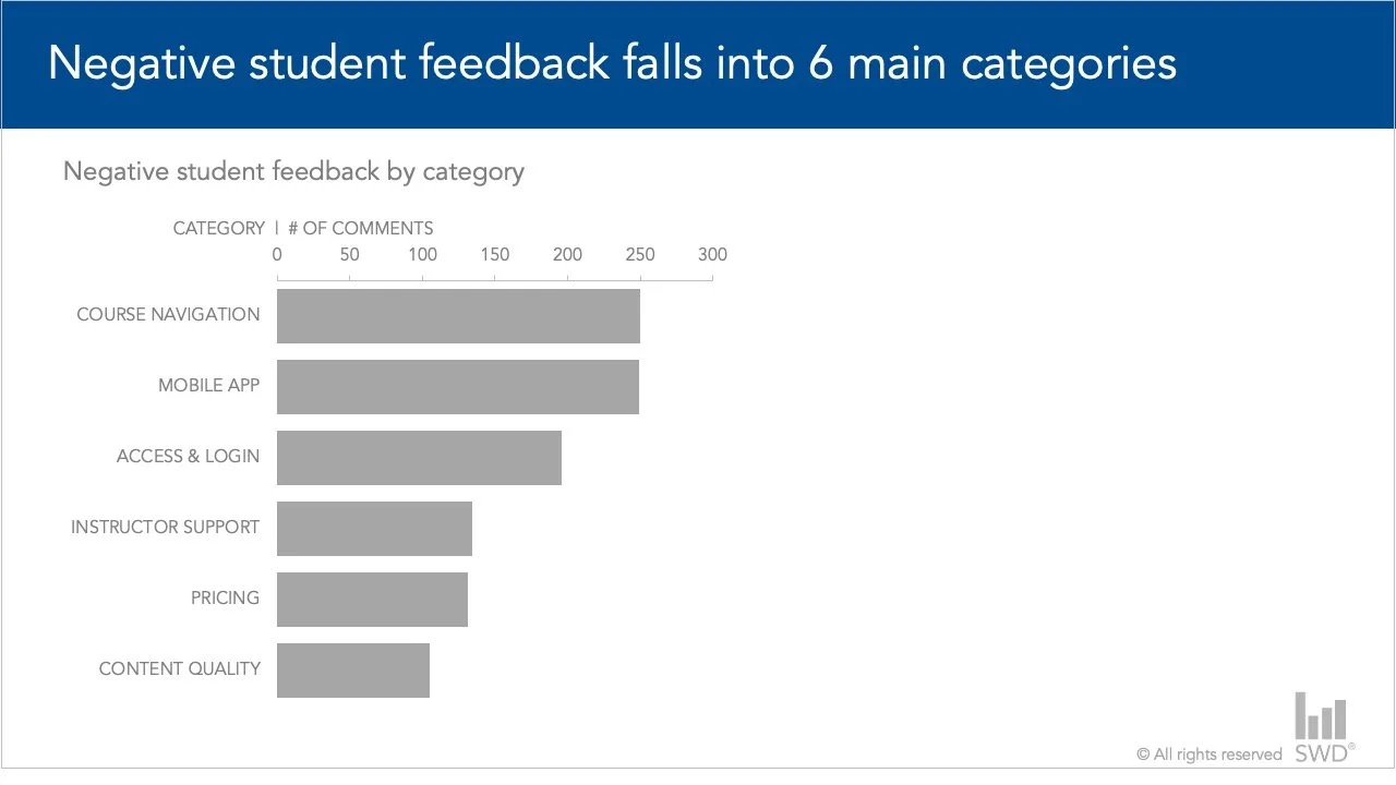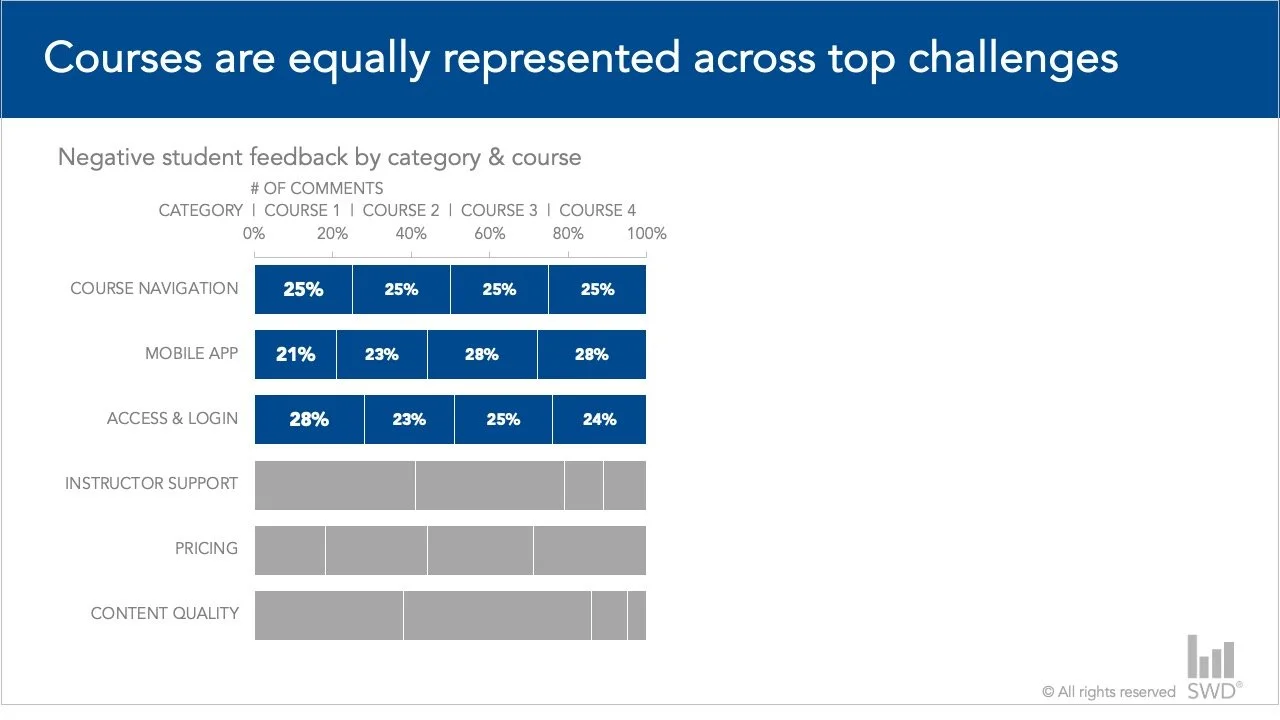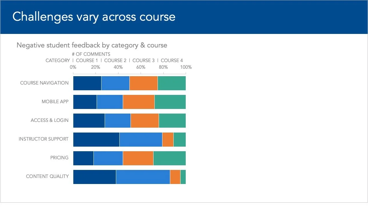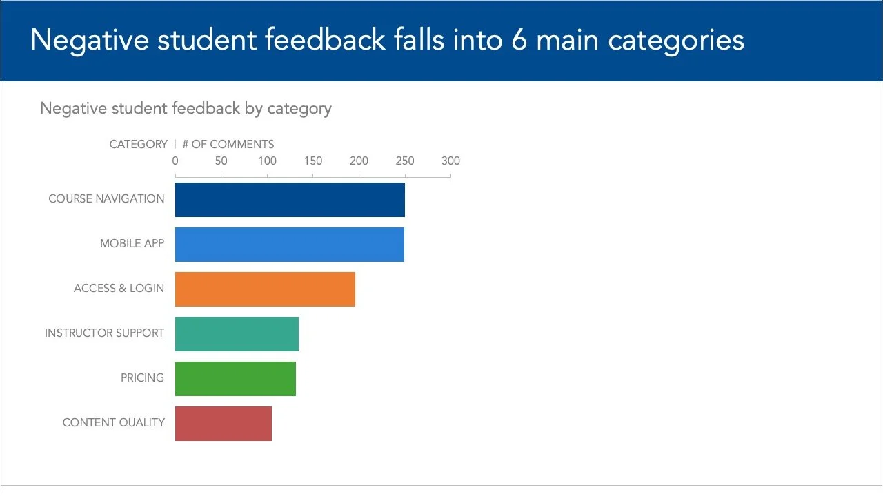 Specifically, the three largest bars at the top are related to course navigation, the mobile app, and access and login challenges. These account for 65% of the negative feedback we received.