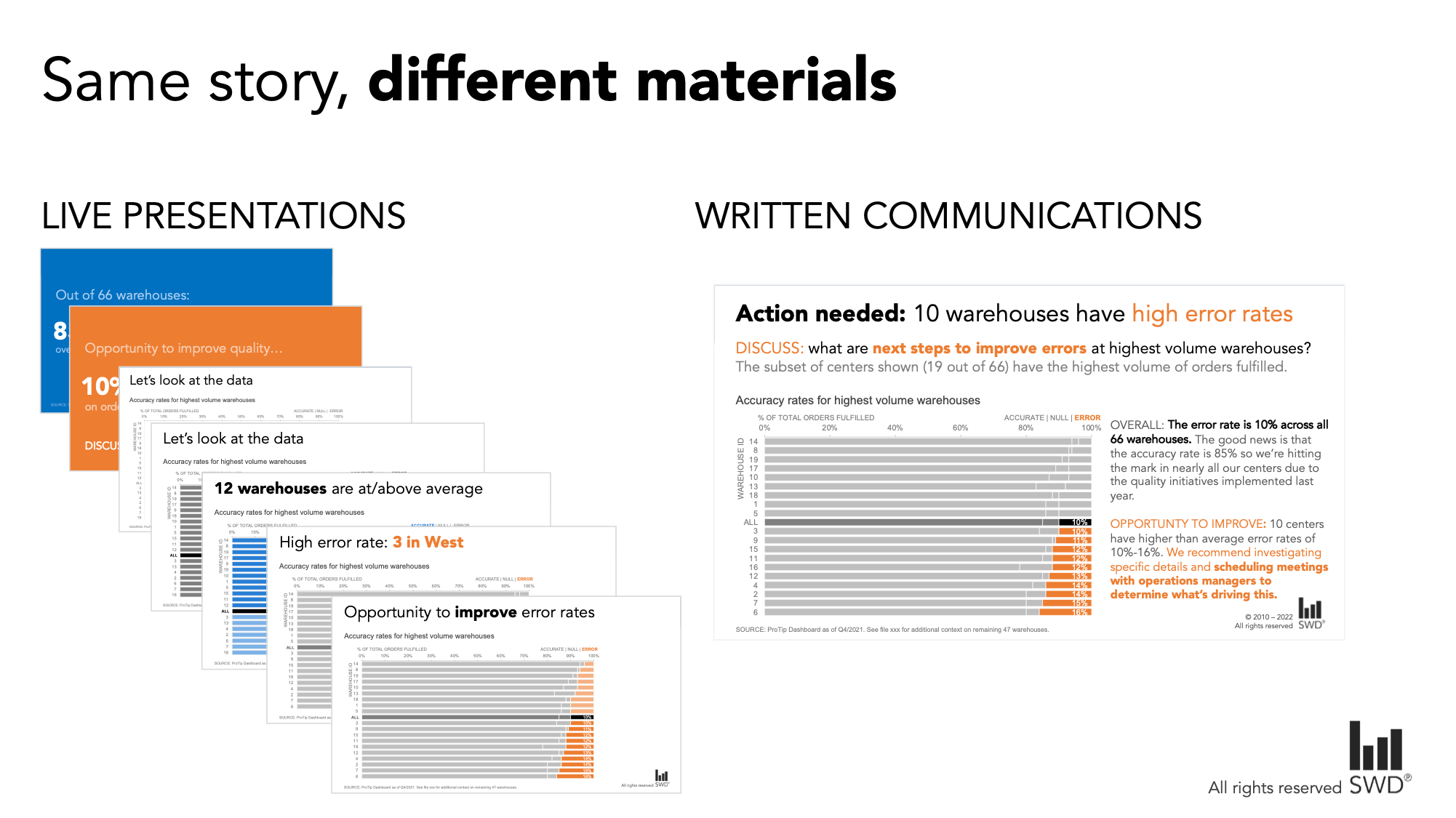 When you’re with your audience—whether virtually or in-person—your graphs and presentation slides can include less context and detail physically written down or shown, because you are there to fill in any blanks. The reverse is true for written communications, where people have a higher tolerance (and perhaps demand) for more detail. This is why live presentations are better suited for sparse slides than written communications.